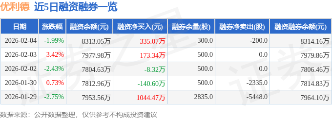 优利德融资融券信息显示,融资方面,当日融资买入782.58万元,融资偿还447.51万元,融资净买入335.07万元。融券方面,融券卖出0.0股,融券偿还200.0股,融券余量300.0股,融券余额1.11万元。融资融券余额8314.16万元。